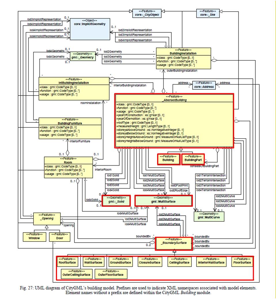 Within the Building module, the two classes (features) Building and BuildingPart are taken into account, including their bounding surface objects _BoundarySurface, such as, for example, RoofSurface, WallSurface, GroundSurface etc.