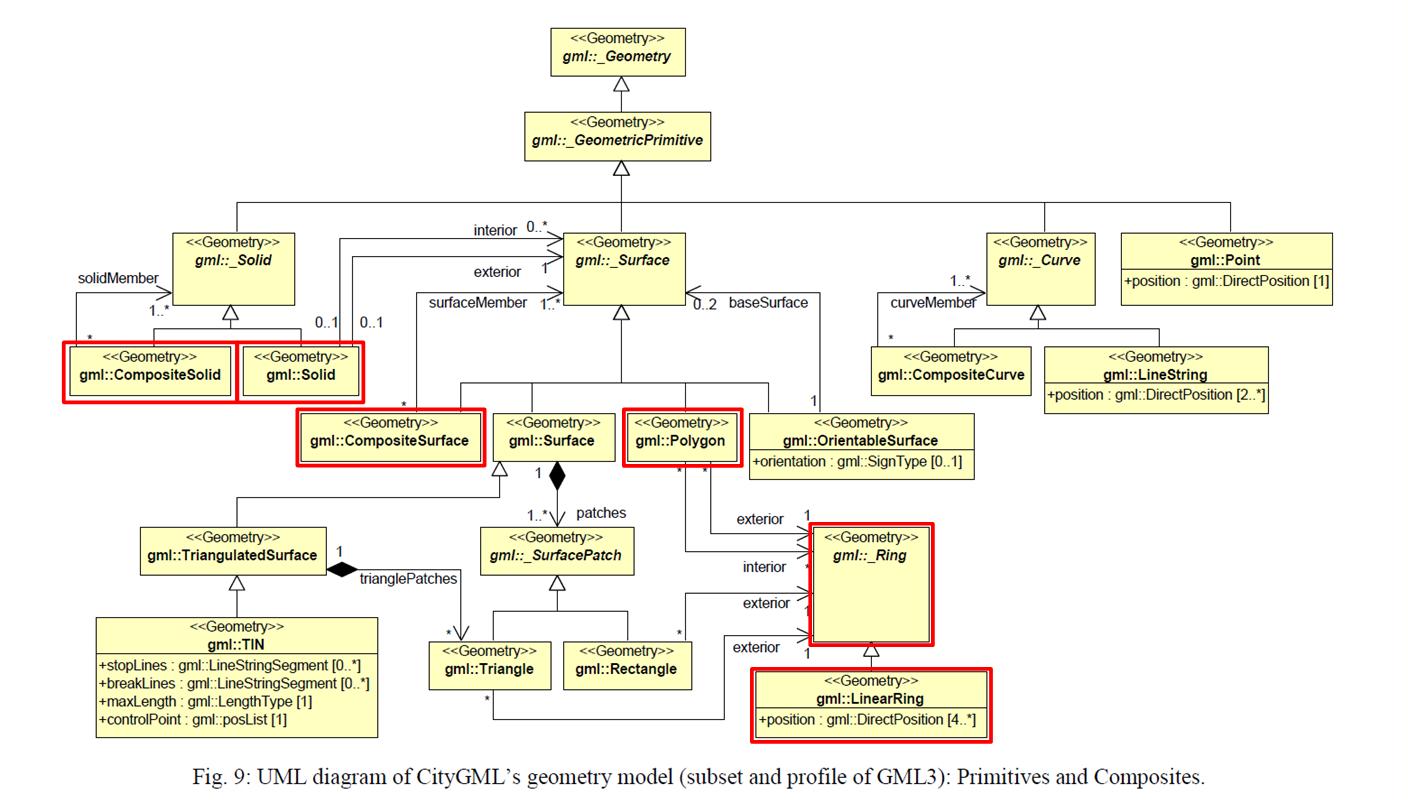 CityGML supports different geometry types of GML. For the transformation of 3D city models with a focus on buildings, the support of solid and simple surface geometries is sufficient. The following figure shows the geometry types relevant and supported for the transformation of buildings in this project (i.e. the simple geometries Solid, Polygon with LinearRing and the composite geometries CompositeSolid, CompositeSurface and MultiSurface)