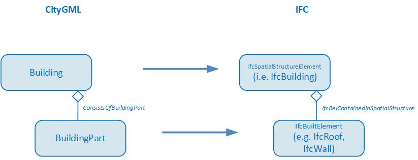 For the mapping between CityGML and IFC the aggregation hierarchy between Building and BuildingPart of CityGML is converted into a hierarchy between building elements (child elements of IfcBuiltElement) and spatial structure elements (child elements of IfcSpatialStructureElement) using the spatial containment concept (IfcRelContainedInSpatialStructure).