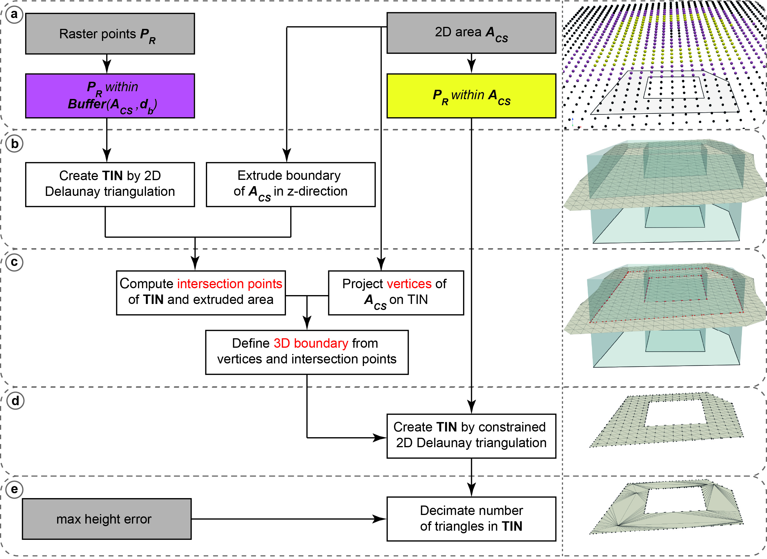 First, all grid points within a specific buffer (user-definable argument) around the 2D polygon object are extracted. A 2D Delaunay triangulation is applied to the retrieved subset of grid points to obtain a triangulated irregular network (TIN). Then, the vertices of the polygon object are projected onto the surface by using raytracing along the z-unit vector (0,0,1). For each line segment of the polygon object a vertical plane is defined and intersection points of all triangle edges are calculated. The new surface object with all grid points within the polygon object and a boundary consisting of all vertices and intersection point is defined. The new surface is again triangulated using a 2D Delaunay triangulation. To reduce the number of triangles it is possible to apply a simplification of the TIN by specifying the maximum acceptable height error (user-definable argument). The following figure shows the geometry conversion schematically.
