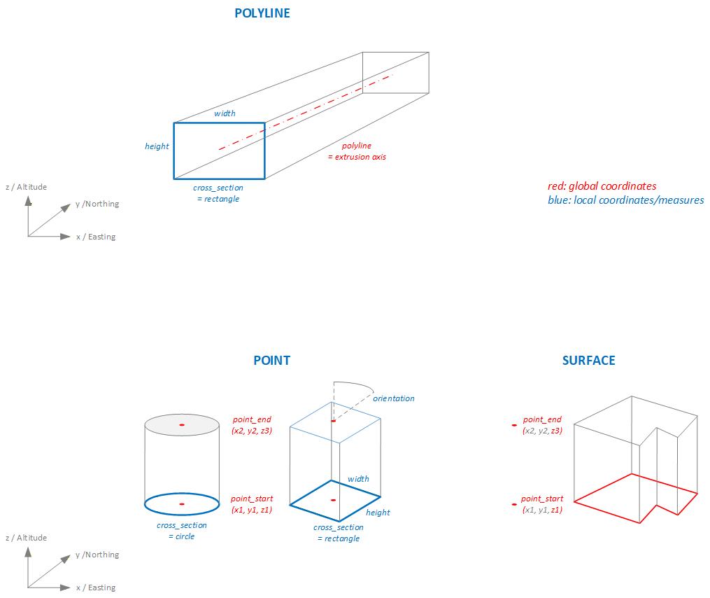 | polygon | Cross section, 2D polygon in WKT format in [m]. If extrusion_type = POLYLINE: A cross-sectional area defined in a local coordinate system in which the extrusion axis passes through the origin (0,0). The cross-sectional area is always defined as being orthogonal to the extrusion axis. If extrusion_type = POINT: A cross-sectional area in local coordinate system. The area is always defined in the xy-plane of the parent, absolute coordinate system (e.g. LV95). The cross-sectional area is extruded between the points point_start and point_end without being rotated relative to the xy-plane. If extrusion_type = SURFACE: Surface in absolute coordinate system (e.g. LV95). The surface is always defined in the xy-plane of the parent coordinate system (e.g. LV95). The surface is extruded between the z-values of the points point_start and point_end and in the direction defined by point_start and point_end, without being rotated relative to the xy-plane. |