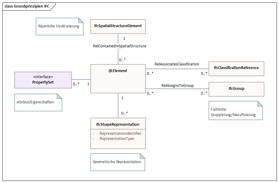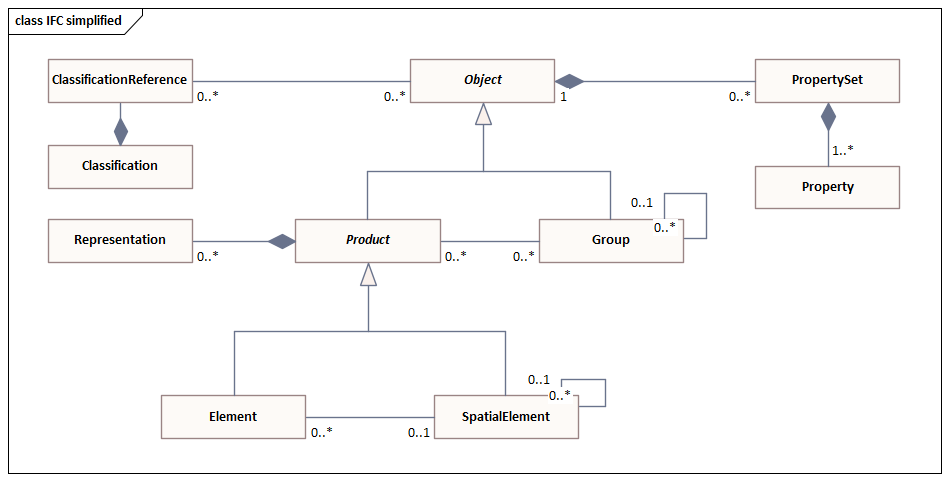 The data model shown above is simplified and conceptualised. In fact, the data model of IFC is much more structured and uses, amongst other things, inheritance relationships and relationship classes. The figure below shows the same core elements again, but taking into account the most important inheritance relationships from IFC (note: this figure is also a simplified representation).