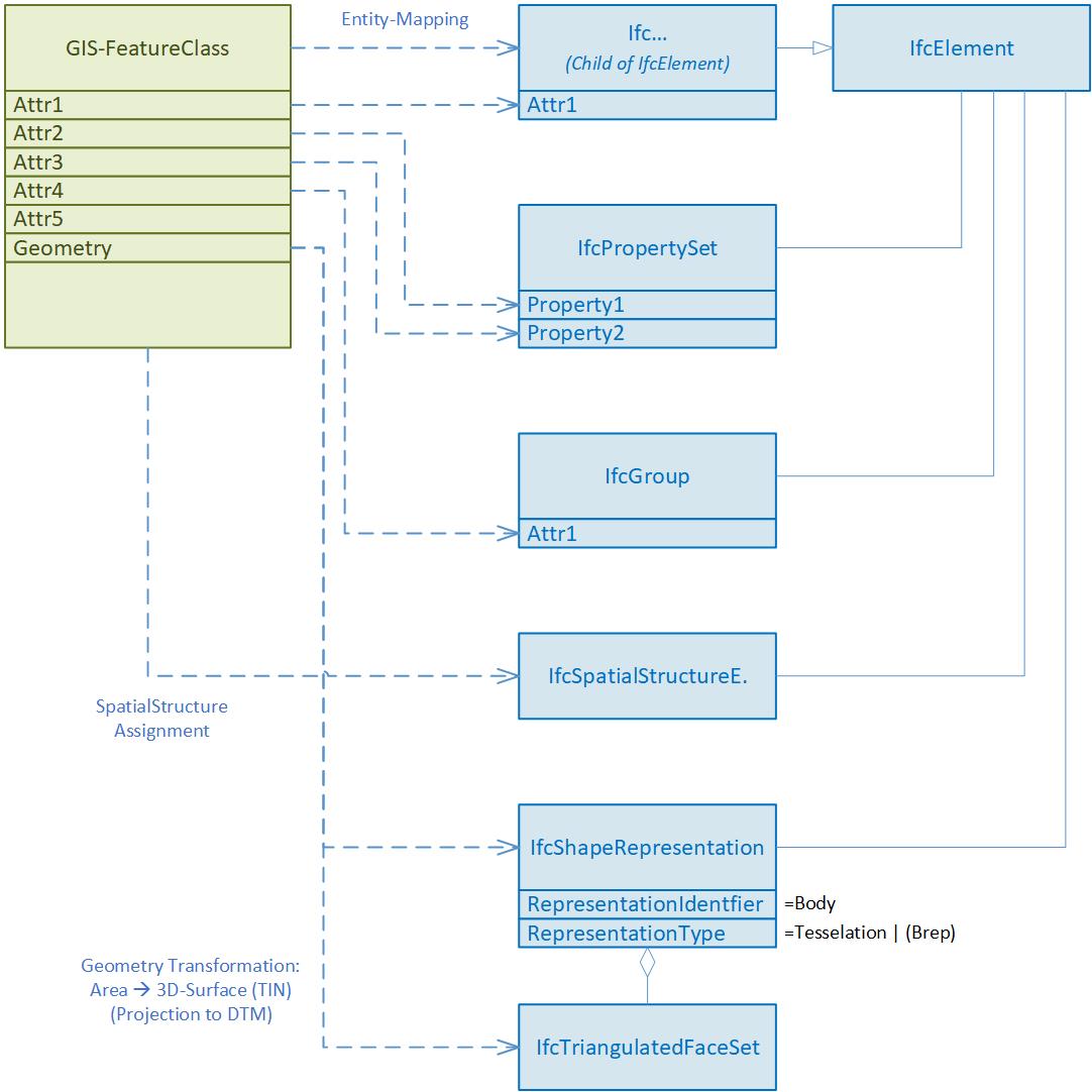 The transformation of a GIS feature type into the IFC schema takes place as shown in the following figure.