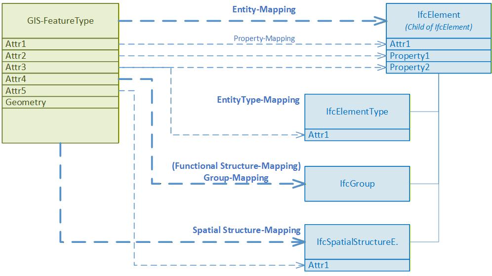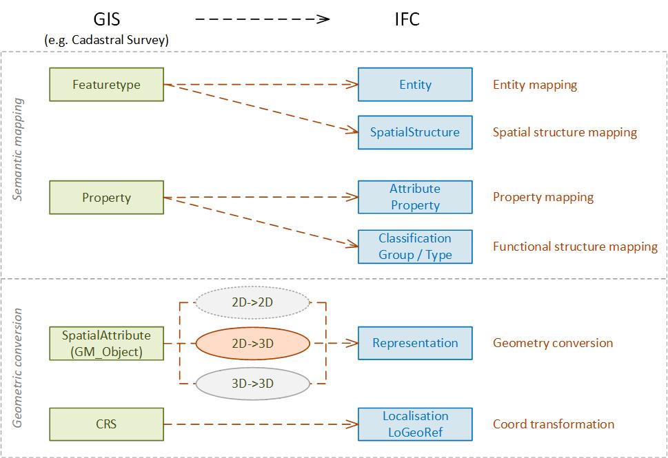To convert a typical geodataset to IFC, both semantic mappings and geometric conversions must be defined, see figure below.